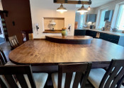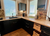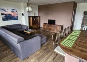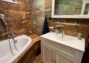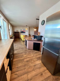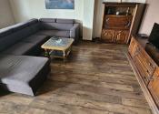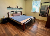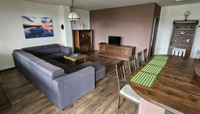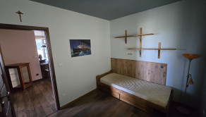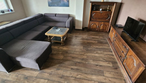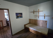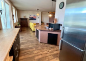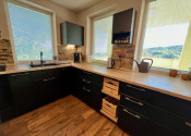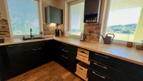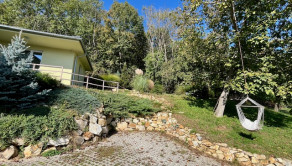 V hlavnej časti domu je vstupná chodba, 3 spálne, kúpeľňa s vaňou a WC, priestranná obývačka s kuchyňou a výstup na terasu o veľkosti 50 m2, ktorú ju možné v prípade záujmu preskliť a spraviť z nej zimnú záhradu, prípadne ďalšiu izbu, z ktorej je skutočne nádherný výhľad. Kuchynský stôl, rovnako kuch.linka sú robené na mieru a majitelia sa snažili využiť každý priestor. Veľkou “vychytávkou” je otvor na vhod špinavého prádla priamo do koša v spodnej kúpeľni v úložnej časti kuchynského stola. V obývačke je krb, ktorý dokáže krásne vykúriť celý dom. Orientácia domu J – JV.