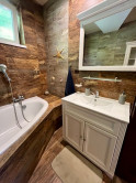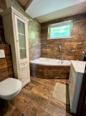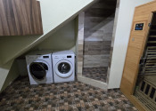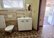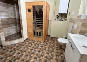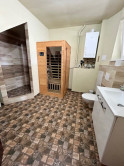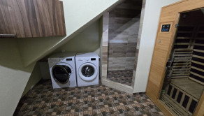 Dispozícia: veľká garáž s východom na chodbu, ktorá rozdeľuje priestor na 2 časti, vpravo je kúpeľňa so saunou, sprchovým kútom, toaletou a kotlom. Oproti je izba (spálňa, pracovňa) s podlahovým vykurovaním a prípravou na krbové kachle. Priamo z chodby vedú schody do hlavnej časti domu, kde sa samozrejme dostaneme aj hlavným vchodom.
