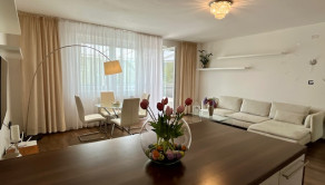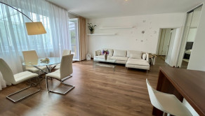 Pozostáva zo vstupnej chodby s odkladacím priestorom a vstavanej skrine, z kúpeľne s vaňou a pračkou a samostatnou toaletou. Z 2 spální, kde jedna je kompletne zariadená vrátane vstavanej skrine po celej dĺžke a s výstupom na terasu, v druhej je priestor použiť ju tak na spálňu ako aj pracovňu. Najväčšou miestnosťou je obývacia izba s jedálňou a kuchyňou, s výstupom na veľkorysú terasu, ktorá poskytuje priestor na oddych, posedenie, grilovanie aj poobedné leňošenie. Byt je veľmi dobre situovaný, nachádza sa v kľudnej, krásnej lokalite v tichom prostredí a pritom kúsok od centra mesta.