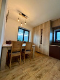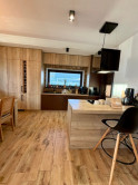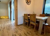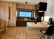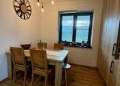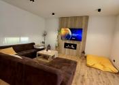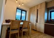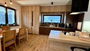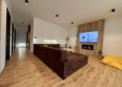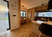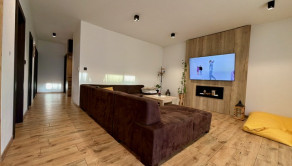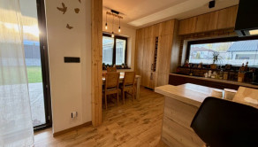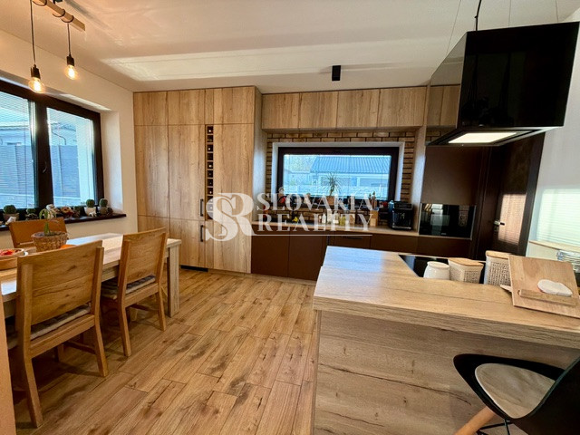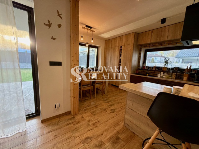 Interiér vás očarí hneď pri vstupe – dom je nový, vkusne a moderne zariadený a predáva sa kompletne vybavený tak, ako ho vidíte. Dominantou priestoru sú veľkoformátové francúzske okná, ktoré prepúšťajú množstvo prirodzeného svetla, štýlový kuchynský ostrovček a prepojenie interiéru s exteriérom.
