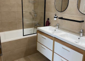 Kuch.linka je vybavená na okamžité používanie. Byt je veľmi príjemne dispozične riešený. Kuchyňa je prepojená s obývacou miestnosťou a jedálňou, v ktorej je veľký balkón s výhľadom na mesto. 2 samostatné spálne poskytujú dostatok priestoru a komfortu na pokojné bývanie. Byt je zariadený vkusným nábytkom na mieru.